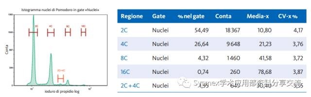 圖2中使用的番茄樣本顯示出核內(nèi)復(fù)制與DNA復(fù)制的相關(guān)性,如有絲分裂,但是沒有區(qū)分核和細(xì)胞自身。核內(nèi)復(fù)制的峰是疊加在經(jīng)典的細(xì)胞周期峰上的: