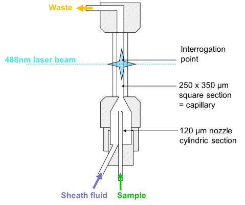Partec擁有超過40年的流動室設(shè)計經(jīng)驗與技術(shù),其生產(chǎn)的高機械精密度石英流動室內(nèi)徑250um×350um,不易堵塞,散射粒度范圍跨度涵蓋100nm至100μm。其核心技術(shù)是顆粒在高速流經(jīng)流動室時,通過高壓鞘液的包裹,準確、穩(wěn)定、連續(xù)地通過各個激光的光斑中心,被激發(fā)的熒光信號通過光膠耦合下的大孔徑物鏡被最大程度地接收。高精度石英流動室的專利技術(shù)可保證所有參數(shù)的精確度達到很高,即變異系數(shù)CV≤2%,樣本采用計算機控制推進器技術(shù),其單一方向通過流動室,有效避免了交叉污染。