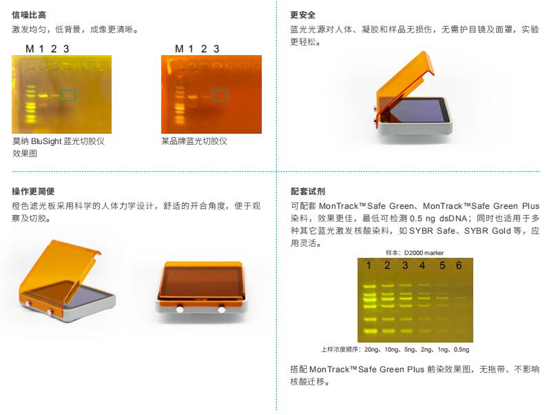 BluSight藍(lán)光切膠儀主要應(yīng)用于藍(lán)光激發(fā)的核酸染料標(biāo)記的凝膠觀察及切膠。采用科學(xué)的人體力學(xué)設(shè)計,舒適的開合角度,使得切膠觀察更輕松。藍(lán)光光源保護(hù)樣品更保護(hù)操作者安全,可配套莫納安全核酸染料使用,也適配多種藍(lán)光染料,應(yīng)用更靈活。體積小巧,節(jié)省空間,觀察、切膠好助手。