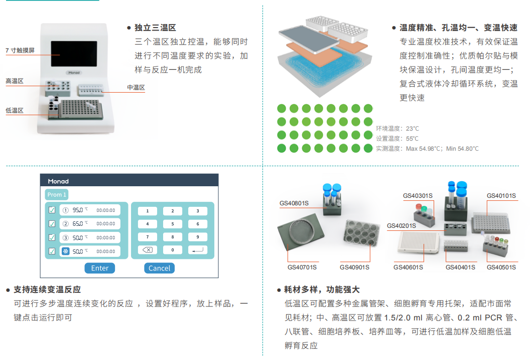 中溫區(qū):可設(shè)置溫度范圍為 8~99.9℃,用于試劑樣品的解凍、酶切實(shí)驗(yàn)、熱激反應(yīng)及逆轉(zhuǎn)錄類連續(xù)變溫反應(yīng)等 。